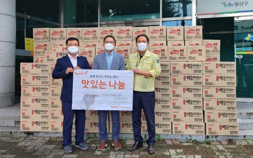 [½Åµ¿¾Æ¹æ¼Û=°¼º´ë ±âÀÚ] »ï¾ç½Äǰ ±¤ÁÖÁöÁ¡(±è¿µ¹è ÁöÁ¡Àå)Àº Áö³ 16ÀÏ »ï¾ç¿øµ¿¹®ÈÀç´ÜÀ» ÅëÇØ ±¤»ê±¸¿¡ 500¸¸¿ø »ó´çÀÇ ½Äǰ 150¹Ú½º¸¦ ±âŹÇß´Ù°í 17ÀÏ ¹àÇû´Ù.
