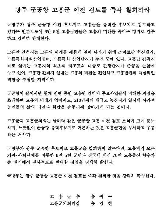 ±¹¹æºÎ°¡ ±¤ÁÖ ±º°øÇ× Èĺ¸Áö·Î °íÈﱺÀ» öȸÇÏÁö ¾Ê´Â´Ù¸é, ±ºÀº °íÈïÁö¿ª ¸ðµç ±â°ü‧»çȸ´Üü¸¦ ºñ·ÔÇÑ 6¸¸ 5õ ±º¹Î°ú Àü±¹ÀÇ 70¸¸ °íÈïÃâ½Å Çâ¿ì°¡ ÃÑ ±È±âÇØ¼ °á»çÀûÀ¸·Î ¹Ý´ëÇÒ °èȹÀÌ´Ù.