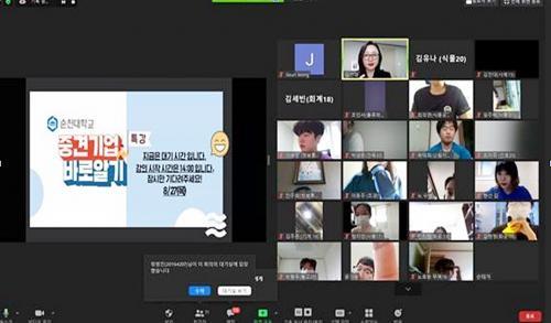 ½ÅÁ¾ Äڷγª¹ÙÀÌ·¯½º °¨¿°Áõ(Äڷγª19) È®»ê ¹æÁö¸¦ À§ÇØ È»óȸÀÇ Ç÷§Æû ÁÜ(ZOOM)À» Ȱ¿ëÇÑ Çü½ÄÀ¸·Î ºñ´ë¸é ½Ç½Ã°£ °ÀÇ·Î ÀÌ·ç¾îÁ³À¸¸ç, ÃÑ 82¸íÀÇ ÇлýÀÌ Âü¿©ÇÏ¿© ¡âÁß°ß±â¾÷¿¡ ´ëÇÑ ¿Ã¹Ù¸¥ ÀÌÇØ ¡âÁß°ß±â¾÷ Ž»ö ¡âÁß°ß±â¾÷ Ãë¾÷Àü·« ¡â´Ù¾çÇÑ Job-Portal Á¤º¸ µîÀ» °øÀ¯ÇÏ¿´´Ù.
