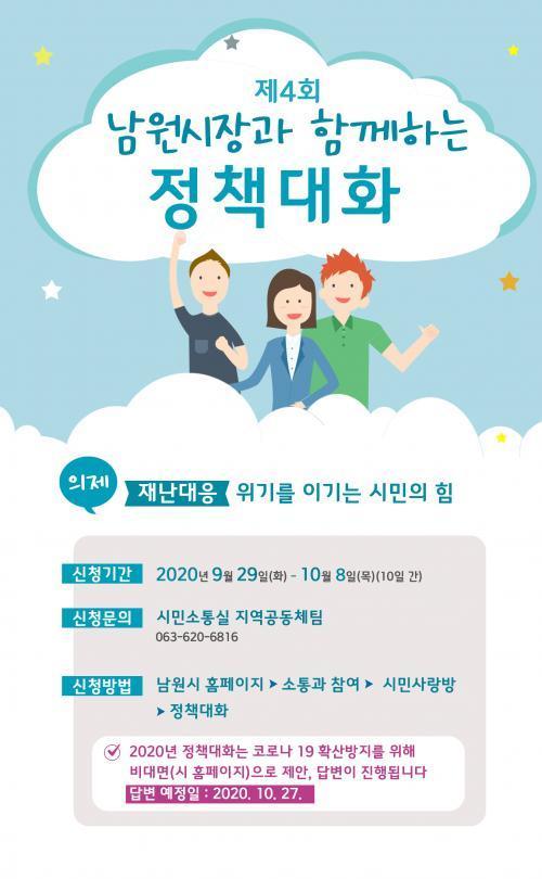 ½Ã ȨÆäÀÌÁö³» Á¤Ã¥´ëȹ濡¼ Á¤Ã¥¼³¸í, Á¦¾È, ´äº¯ ¼øÀ¸·Î ÁøÇàµÇ´Â À̹ø Á¦4ȸ Á¤Ã¥´ëÈ´Â <[Àç³´ëÀÀ] À§±â¸¦ À̱â´Â ½Ã¹ÎÀÇ Èû>À̶ó´Â ÀÇÁ¦·Î Äڷγª19¿Í ¼öÇØ µî Àç³´ëÀÀ¿¡ ´ëóÇÏ´Â Á¤Ã¥ÀÇ Á¦¾È, Àǰß(¡ã³ªºÎÅÍ, ¿ì¸® °¡Á·ºÎÅÍ ½ÇõÇÒ ¼ö ÀÖ´Â ÀÛÀº ½Çõ¿¡ ´ëÇÑ Àǰß, ¡ã½Ã¹ÎµéÀÇ ÀÚ¹ßÀûÀΠȰµ¿ÀÌ ÇÊ¿äÇÑ ºÎºÐ°ú À̸¦ µÞ¹ÞÄ§ÇØÁÖ±â À§ÇØ ÇÊ¿äÇÑ Á¤Ã¥¿¡ ´ëÇÑ Á¦¾È µî)À» ȨÆäÀÌÁöÀÇ ¼½Ä¿¡ ÀÛ¼ºÇØ ¿À´Â 10¿ù 8ÀÏ(¸ñ)±îÁö Á¦ÃâÇÏ¸é µÈ´Ù.