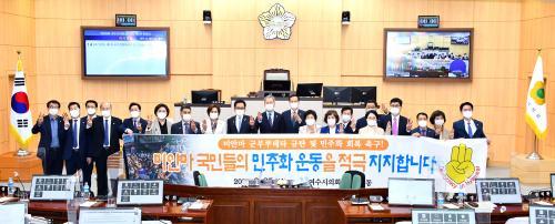 ¿©¼ö½ÃÀÇȸ(ÀÇÀå Àüâ°ï)°¡ ¹Ì¾á¸¶ Äíµ¥Å¸ »çÅÂ¿Í °ü·ÃÇØ ±ººÎÀÇ ½ÃÀ§´ë ¹«·ÂÁø¾ÐÀ» ±ÔźÇÏ°í ¹ÎÁÖÈ È¸º¹À» Ã˱¸ÇÏ°í ³ª¼¹´Ù.