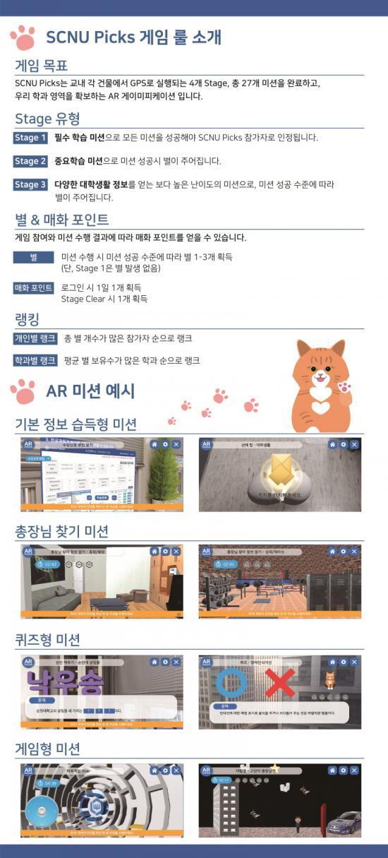 ¡®SCNU Picks¡¯´Â ¼øÃµ´ë ½ÅÀÔ»ýÀÌ ÀÔÇÐÇÏ¿© Á¹¾÷Çϱâ±îÁö ¹Ýµå½Ã ¾Ë¾Æ¾ß ÇÏ´Â Á¤º¸ ¹× À¯¿ëÇÑ ÄÜÅÙÃ÷¸¦ 27°³ÀÇ AR/VR ¹Ì¼ÇÀ¸·Î °ÔÀÓÈ(gamification)ÇÑ °ÍÀ¸·Î, ÀçÇлýÀÇ ¼º°øÀûÀÎ Çб³»ýȰ ÀûÀÀÀ» À§ÇØ Áö³ 2019³â ´ëÇÐÇõ½ÅÁö¿ø»ç¾÷ÀÇ ÀÏȯÀ¸·Î °³¹ßµÇ¾î ¿ÃÇØ µÎ ¹øÂ° °³½ÃÇÏ´Â °ÍÀÌ´Ù.