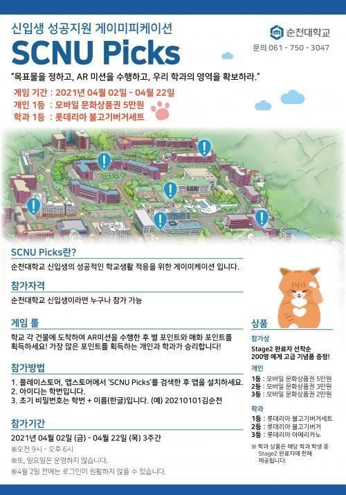¡®SCNU Picks¡¯´Â ¿ÀÁ÷ ¼øÃµ´ë 2021Çйø ½ÅÀÔ»ý¸¸ Âü¿©ÇÒ ¼ö ÀÖµµ·Ï ¼³°èµÇ¾î µ¿±Þ»ý °£ÀÇ °¡º¿î °æÀïÀ» ÅëÇØ °ÔÀÓ¿¡ ¸ôÀÔÇÒ ¼ö ÀÖ°Ô ÇßÀ¸¸ç, 4°³ÀÇ ½ºÅ×ÀÌÁö, 27°³ÀÇ ¹Ì¼ÇÀ» Â÷·Ê·Î ¿Ï¼öÇÏ´Â °úÁ¤¿¡¼ ¡ã´ëÇÐ ³» ÁÖ¿ä ½Ã¼³ÀÇ ¿ëµµ¿Í Ȱ¿ë¹ý ¡ãÁ¹¾÷ÀÚ°ÝÀÎÁõÁ¦¿Í °°Àº ¹Ýµå½Ã ¾Ë¾Æ¾ß ÇÏ´Â ±ÔÁ¤ ¡ã¼±¹èµéÀÇ À¯¿ëÇÑ ´ëÇлýȰ ÆÁ ¡ãÀå¾ÖÀÎ½Ä °³¼± ¹× ¼ºÈñ·Õ ¿¹¹æ ±³À° µî ´Ùä·Î¿î ±³À° Á¤º¸¸¦ ½ÀµæÇÒ ¼ö ÀÖ°Ô µÈ´Ù.