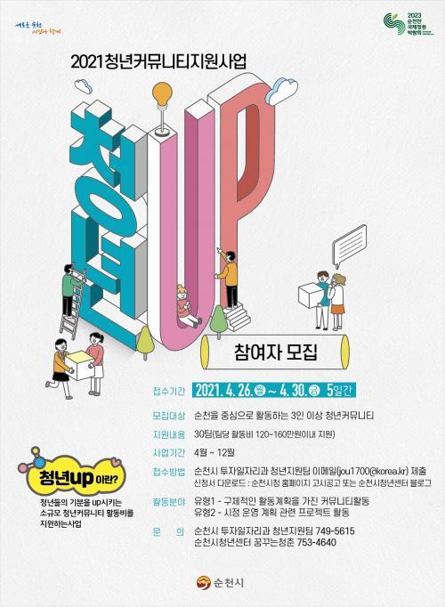 û³â Ä¿¹Â´ÏƼÁö¿ø»ç¾÷ ¡®Ã»³âUP¡¯Àº ¼øÃµ½Ã¿¡ °ÅÁÖÇϰųª Ȱµ¿ÇÏ´Â 3ÀÎ ÀÌ»óÀÇ Ã»³â Ä¿¹Â´ÏƼ ´ë»óÀ¸·Î Ȱµ¿ºñ¸¦ Áö¿øÇÏ¿© û³âµé¿¡°Ô »îÀÇ È°·ÂÀ» ºÒ¾î³Ö¾î Ȱ±âÂù û³â¹®È¸¦ Çü¼ºÇϵµ·Ï Áö¿øÇÏ´Â »ç¾÷ÀÌ´Ù.