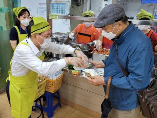 À̳¯ ±Ç ½ÃÀåÀº Äڷγª19¿Í ½ÄÁßµ¶ ¿¹¹æÀ» À§ÇØ ¸¶½ºÅ© ¹× À§»ý¸ð, À§»ýÀå°©À» Âø¿ëÇÏ°í º¹Áö°ü ȸ¿ø 150¿© ¸í¿¡°Ô °£½ÄÀ» Àü´ÞÇß´Ù.