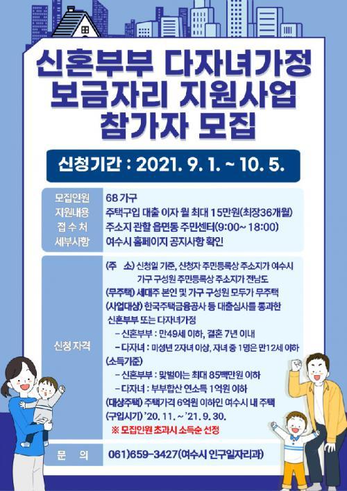 ½Åû ÀÚ°ÝÀº ¿©¼ö½Ã¿¡ °ÅÁÖÇÏ´Â ¹«ÁÖÅà ½ÅÈ¥ºÎºÎ(°áÈ¥ 7³â ÀÌÇÏ, ºÎºÎ ¸ðµÎ ¸¸ 49¼¼ ÀÌÇÏ) ¶Ç´Â ´ÙÀڳడÁ¤(¹Ì¼º³â ÀÚ³à 2¸í ÀÌ»óÀ̸ç 1¸íÀº ¸¸12¼¼ ÀÌÇÏ)À¸·Î, Çѱ¹ÁÖÅñÝÀ¶°ø»ç µîÀÇ ´ëÃâ½É»ç¸¦ Åë°úÇØ 2020³â 11¿ùºÎÅÍ 2021³â 9¿ù¿¡ ¿©¼ö½Ã ³»¿¡ ½Å±Ô·Î ÁÖÅÃÀ» ±¸ÀÔÇÑ ¼¼´ëÀÌ´Ù.