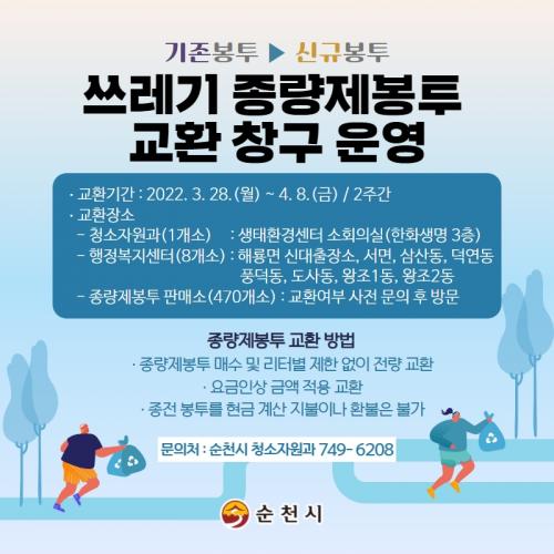 ¼øÃµ½Ã û¼ÒÀÚ¿ø°ú °ü°èÀÚ´Â ¡°4¿ùºÎÅÍ´Â ±âÁ¸ Á¾·®Á¦ ºÀÅõ¸¦ ½Å±ÔºÀÅõ·Î ±³È¯ÇÏ¿© »ç¿ëÇØ¾ß ÇÑ´Ù.¡±¸ç ¡°»ýȰ¾²·¹±â¸¦ ÁÙ¿© ±ú²ýÇÑ µµ½Ã¸¦ ¸¸µé±â À§ÇØ ½Ã¹Î ¿©·¯ºÐÀÇ Àû±ØÀûÀÎ Âü¿©¿Í ÇùÁ¶¸¦ ºÎʵ台´Ù.¡±¶ó°í ¸»Çß´Ù.