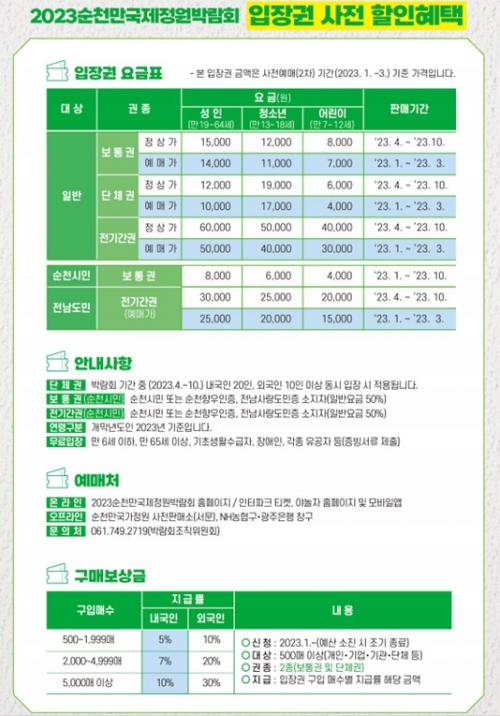 2023¼øÃµ¸¸±¹Á¦Á¤¿ø¹Ú¶÷ȸ ¿¹¸Å ÀÔÀå±ÇÀº ¹Ú¶÷ȸ ´çÀÏ ÀÔÀåÀÌ °¡´ÉÇÑ ¡®º¸Åë±Ç¡¯°ú Àü ±â°£ ÀÚÀ¯ ÀÔÀåÀÌ °¡´ÉÇÑ ¡®Àü±â°£±Ç¡¯ÀÌ ÀÖ´Ù. ÇÒÀÎ ÇýÅÃÀÌ Àû¿ëµÈ º¸Åë±ÇÀº Á¤»ó°¡¿¡¼ 1õ¿øÀ» ÇÒÀÎÇØ ¼ºÀÎ 1¸¸ 4õ¿ø, û¼Ò³â 1¸¸ 1õ¿ø, ¾î¸°ÀÌ 7õ¿ø¿¡ ÆÇ¸ÅÇÑ´Ù. ¼øÃµ½Ã¹ÎÀÇ °æ¿ì ¿ì´ë¿ä±ÝÀ» Àû¿ëÇØ ¼ºÀÎ 8õ¿ø, û¼Ò³â 6õ¿ø, ¾î¸°ÀÌ 4õ¿ø¿¡ º¸Åë±ÇÀ» ±¸¸ÅÇÒ ¼ö ÀÖ´Ù.
