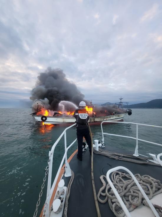 ÇöÀç ÈÀç¼±¹Ú AÈ£´Â ¼±Ã¼ ¿ÜºÎ¿¡ ºÒ²É°ú ÇÔ²² ¸¹Àº ¿¬±â°¡ ¹ß»ýÇϰí ÀÖ¾î °æºñÇÔÁ¤ 6ôÀÌ µ¿¿øµÅ ¼ÒÈ Àåºñ¸¦ ÀÌ¿ëÇØ ÈÀçÁø¾Ð¿¡ ³ª¼°í ÀÖ´Ù.