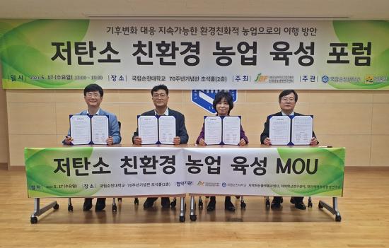 ¼øÃµ´ëÇб³ À嵿½Ä Áö¿ªÇõ½Å¿¬±¸¼¾ÅÍÀåÀº ¡°À̹ø ¡®Àúź¼Ò ģȯ°æ ³ó¾÷ À°¼º¡¯ Æ÷·³Àº ±âÈĺ¯È À§±â ½Ã´ëÀÇ ´ëÀÀÃ¥À¸·Î ģȯ°æ³ó¾÷ÀÇ ¹ßÀüÀ» À§ÇÑ Áß¿äÇÑ ÀÚ¸®¡±¶ó¸ç, ¡°¹«¾ùº¸´Ù Àü³²ÀÇ ¹Î¡¤°ü¡¤»ê¡¤ÇÐÀÌ ±âÈĺ¯È ¹× ź¼ÒÁ߸³ ´ëÀÀ °ü·Ã Çù·Â³×Æ®¿öÅ© ±¸ÃàÀ» À§ÇØ ¾÷¹«Çù¾àÀ» ü°áÇÑ °ÍÀ» °è±â·Î Àû±ØÀûÀÎ Çù·Â Ȱµ¿°ú ÇÔ²², ¼øÃµ´ëÇб³ Çлýµé¿¡°Ôµµ ´õ ¸¹Àº ±âȸ°¡ ÁÖ¾îÁö±æ ¹Ù¶õ´Ù.¡±¶ó°í ¹àÇû´Ù.