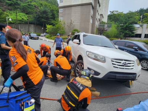 ¿©¼ö¼Ò¹æ¼ 119±¸Á¶´ë¿Í ±¸±Þ´ë¿øÀÌ ÇöÀå¿¡ µµÂøÇѹÙ, ±¸Á¶´ë»óÀÚ 1¸íÀÌ SUV Â÷·® Á¶¼ö¼® ¾Õ¹ÙÄû¿¡ ´Ù¸®°¡ ³¢¿© ³ª¿ÀÁö ¸øÇÏ´Â »óȲÀ̾ú´Ù.