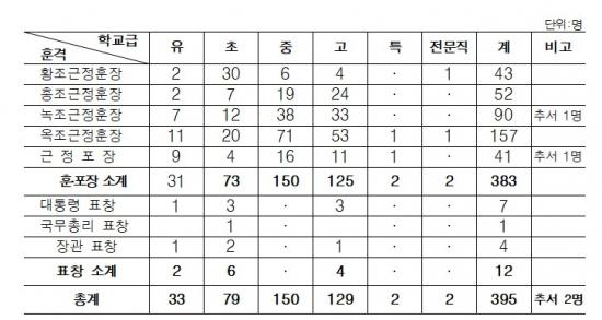 ¡à À̹ø Á¤ºÎÆ÷»ó ´ë»óÀÚ´Â À¯¡¤ÃÊ¡¤Áßµî ±³¿ø 395¸íÀ¸·Î, ȲÁ¶±ÙÁ¤ÈÆÀå 43¸í, È«Á¶±ÙÁ¤ÈÆÀå 52¸í, ³ìÁ¶±ÙÁ¤ÈÆÀå 90¸í, ¿ÁÁ¶±ÙÁ¤ÈÆÀå 157¸í, ±ÙÁ¤Æ÷Àå 41¸í, ´ëÅë·Éǥâ 7¸í, ±¹¹«ÃѸ®Ç¥Ã¢ 1¸í, Àå°üǥâ 4¸íÀÌ´Ù.