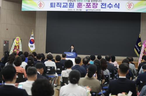 ¡à ±è´ëÁß ±³À°°¨Àº ¿µ¿¹·Î¿î ÈÆ․Æ÷ÀåÀ» ¹ÞÀº ¼ö»óÀÚ¿Í °¡Á·µé¿¡°Ô ±×µ¿¾ÈÀÇ Çå½Å°ú ³ë°í¿¡ Á¸°æ°ú °¨»çÀÇ ¸¶À½À» ÀüÇϸç, ¡°Àλý ÈĹÝÀüÀÇ Ãâ¹ßÀ» ÃàÇÏÇÏ°í ¾ÕÀ¸·Îµµ ¡®Àü³²±³À° ´ëÀüȯ¡¯ÀÇ ±æ¿¡ ¼±¹è ±³À°ÀÚµéÀÇ °æ·û°ú ÁöÇý¸¦ º¸ÅÂÁÙ °Í.¡±À» ´çºÎÇß´Ù.