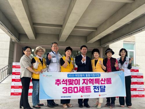Ãß¼®¸ÂÀÌ Áö¿ªÆ¯»ê¹° ¼¼Æ® Àü´ÞÀº »ï¼º¿¡¼ ÈÄ¿øÇØ Èñ¸ÁdzÂ÷ ¹°Ç°Áö¿ø»ç¾÷À¸·Î ÃßÁøµÆ´Ù. ÈÄ¿ø ¹°Ç°Àº Áö¿ªÆ¯»ê¹° ¡ã¹é¹Ì 3kg ¡ãÀâ°î 1kg ¡ã¹Ì¿ª 100g ¡ãÁ¶¹Ì±è 1ÆÑ(16°³ÀÔ) ¡ã°ÇÇ¥°í¹ö¼¸ 100g µî ½Ä·áǰÀ¸·Î ±¸¼ºµÆ´Ù.