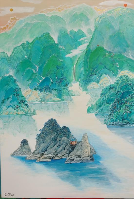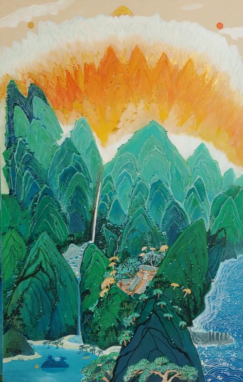 ±×¸² ¼Ó¿¡´Â ¿À¹æ»ö°ú ´ÜûÀÇ Ã»·Ï»ê¼ö ¸Ô°ú ¾ÆÅ©¸±È¥ÇÕ Àç·á·Î ÇÑÁö¿Í ĵ¹ö½º¿¡ °³±Ý°ú ÈëÀ» ÀÔÈ÷°í ÇØ¿Í ´Þ ¹°¼Ò¸®, ¹Ù¶÷¼Ò¸®, ¼Ö¹Ù¶÷ ¼Ò¸®, ¾ÆÄ§ÀÇ »õ¼Ò¸®¸¦ ´ã¾Ò´Ù. ±Ý°»ê, ´Ü¾çÆÈ°æ, Á¦ÁÖµµ µîÀÇ ½ÇÁ¦ dz°æÀº »ó»ó¼ÓÀÇ ´ëÀÚ¿¬À» ¹Ù¶óº¸µí ¸ùȯÀûÀ̰í ȯ»óÀûÀÌ´Ù. ÀüüÀûÀÎ »ê¼¼ÀÇ Çü»óÀ» ÁüÀÛÇÏ°Ô ÇÏ´Â ´É¼±À̳ª ³ª¹«, ÆøÆ÷, ¹ÙÀ§, Áý µîÀÇ ¹¦»ç´Â Çѱ¹È¿¡¼ º¼ ¼ö ÀÖ´Â ±â¹ýÀ¸·Î ÀÌÇØ·ÂÀ» ³ô¿´´Ù.