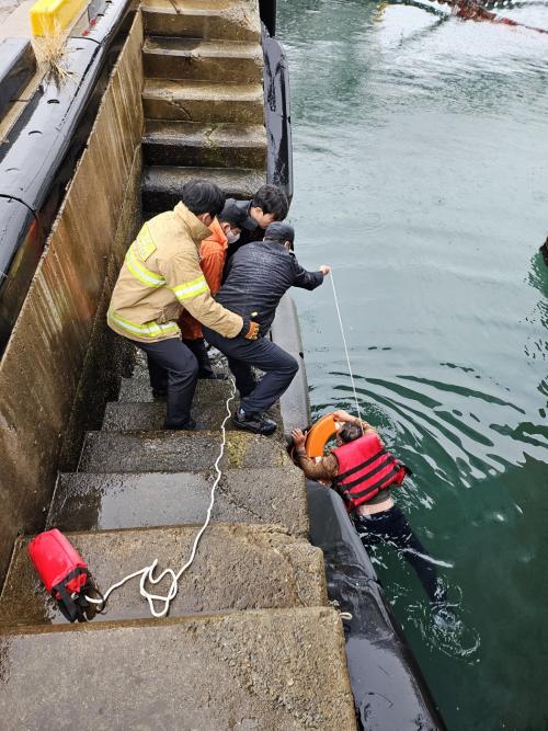 ¹°¿¡ ºüÁ®ÀÖ´ø A¾¾´Â ¹è¿Í ¼±ÂøÀå »çÀÌ¿¡ ¿¬°áµÇ¾î ÀÖ´ø ÁÙÀ» Àâ°í ¹öƼ°í ÀÖ´ø »óȲÀ¸·Î ÇöÀå¿¡ Ã⵿ÇÑ ¼Ò¹æ´ë¿øÀº »ç´Ù¸®¸¦ °íÁ¤ÇÏ¿© A¾¾¿¡°Ô Á¢±Ù ÈÄ ±¸¸íÁ¶³¢¸¦ Àü´ÞÇØ Âø¿ë½ÃŲ ÈÄ ±¸¸íȯ¿¡ ±¸¸íÁÙÀ» ¿¬°áÇÏ¿© A¾¾¿¡°Ô Àü´ÞÇØ Àâ°Ô ÇÑ ÈÄ ±¸Á¶°¡ °¡´ÉÇÑ ¾ÈÀüÇÑ Àå¼Ò·Î ²ø¾î ±¸Á¶¸¦ ¿Ï·áÇÏ¿´´Ù.