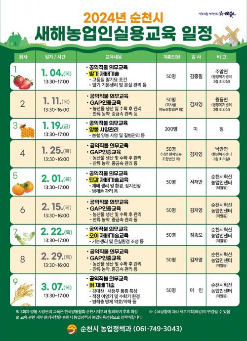 ÀÚ¼¼ÇÑ ÀÏÁ¤Àº ¼øÃµ½Ã³ó¾÷±â¼ú¼¾ÅÍ È¨ÆäÀÌÁö¿¡¼ È®ÀÎÇÒ ¼ö ÀÖÀ¸¸ç, ³ó¾÷ÀÎ ±³À°°ú °ü·ÃµÈ ±Ã±ÝÇÑ »çÇ×Àº ³ó¾÷Á¤Ã¥°ú ³ó¾÷ÀÎÀ°¼ºÆÀ(¢Ï061-749-3043)À¸·Î ¹®ÀÇÇÏ¸é µÈ´Ù.