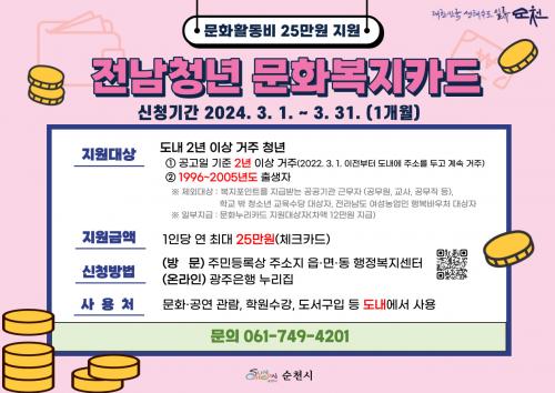 Àü³²Ã»³â ¹®Èº¹ÁöÄ«µå´Â ¼øÃµ½Ã¿¡ °ÅÁÖÇϴ û³â¿¡°Ô °ø¿¬°ü¶÷, Çпø¼ö°, µµ¼±¸ÀÔ µî ¹®Èº¹Áöºñ¸¦ Áö¿øÇÏ´Â »ç¾÷À¸·Î ¿ÃÇØ¿¡´Â 2023³âµµ ´ëºñ 5¸¸¿ø Áõ¾×µÈ 1ÀÎ´ç ¿¬ ÃÖ´ë 25¸¸¿øÀ» Áö¿øÇÑ´Ù.