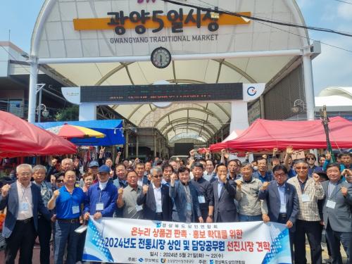 °æ»óºÏµµ »óÀο¬ÇÕȸ Á¤µ¿½Ä ȸÀåÀº ¡°ÈǸ¢ÇÑ ½Ã¼³ ¿©°Ç¿¡ ³ëÁ¡¼± Áؼö, Çùµ¿Á¶ÇÕ ¿î¿µ µî ½ÃÀå »óÀεéÀÇ Àû±ØÀûÀÎ Âü¿©¿¡ ³î¶ú´Ù¡±¸ç ¡°¹°±¤Çü »ç¾÷°ú µðÁöÅÐ ÀüÅë½ÃÀå µî Á¤ºÎ °ø¸ð»ç¾÷À» ¼º°øÀûÀ¸·Î ÃßÁøÇϰí ÀÖ´Â ±¤¾ç5ÀϽÃÀåÀÇ ¼±Áø»ç·Ê¸¦ Àß ¹è¿ö°¡°Ú´Ù¡±°í ÀüÇß´Ù.