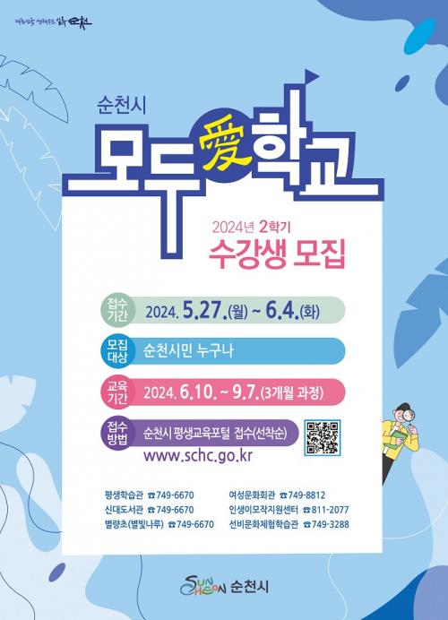¼ö°½ÅûÀº ¼øÃµ½ÃÆò»ý±³À°Æ÷ÅРȨÆäÀÌÁö(www.schc.go.kr)¸¦ ÅëÇØ ¼±Âø¼øÀ¸·Î Á¢¼öÇÏ¸ç ¼øÃµ½Ã¹ÎÀÌ¸é ´©±¸³ª °¡´ÉÇÏ´Ù. ±âŸ ÀÚ¼¼ÇÑ »çÇ×Àº ¼øÃµ½Ã Æò»ý±³À°°ú(749-6670)¿¡ ¹®ÀÇÇÏ¸é µÈ´Ù.