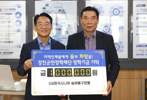 *»çÁø¼³¸í : (»ç)Çѱ¹½Ã´Ï¾î¡¤½Ç¹ö ¹è±¸¿¬¸Í ±è¿ëÅ ȸÀåÀÌ °Áø¿ø ±º¼ö¿¡°Ô ÀåÇбÝÀ» Àü´ÞÇϰí ÀÖ´Ù.